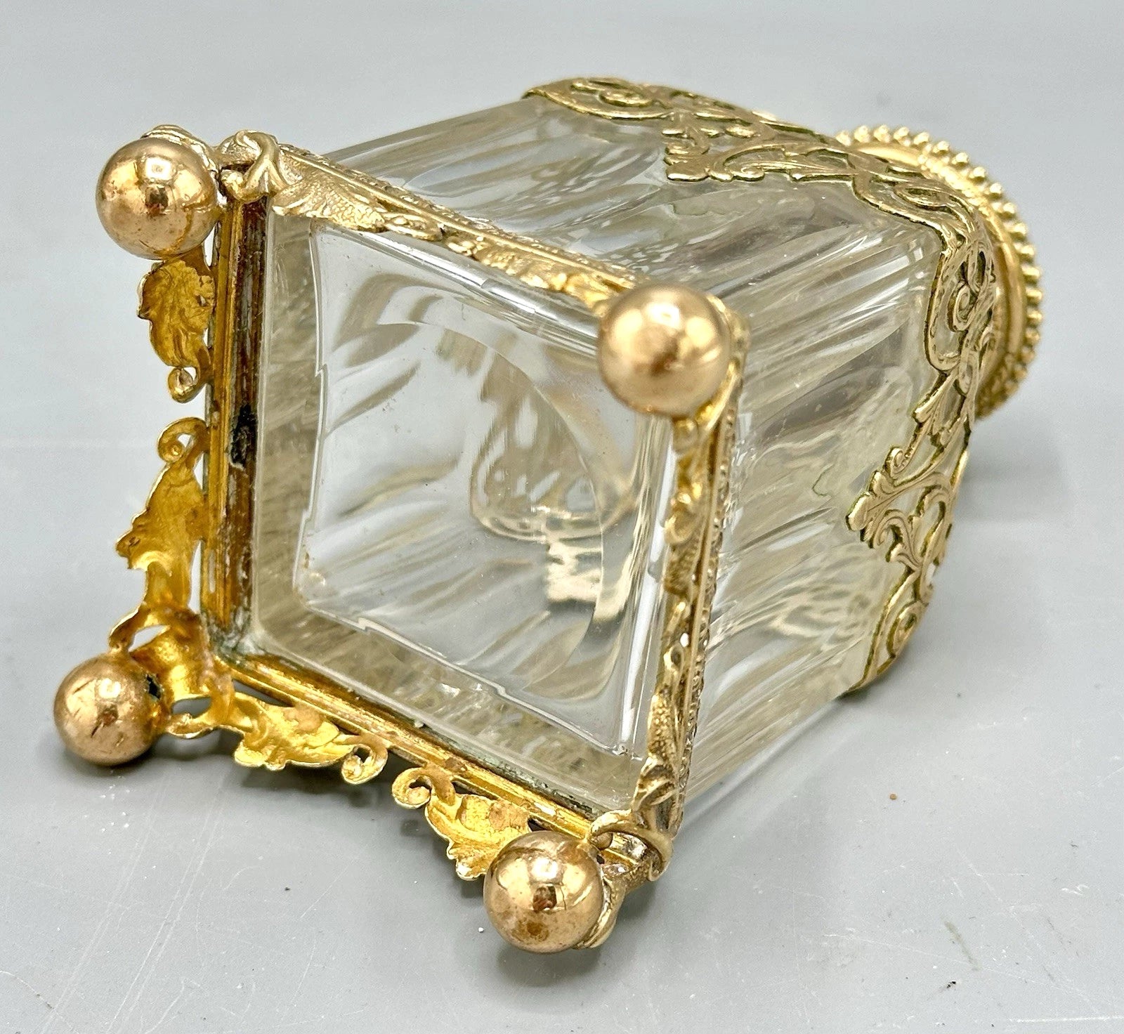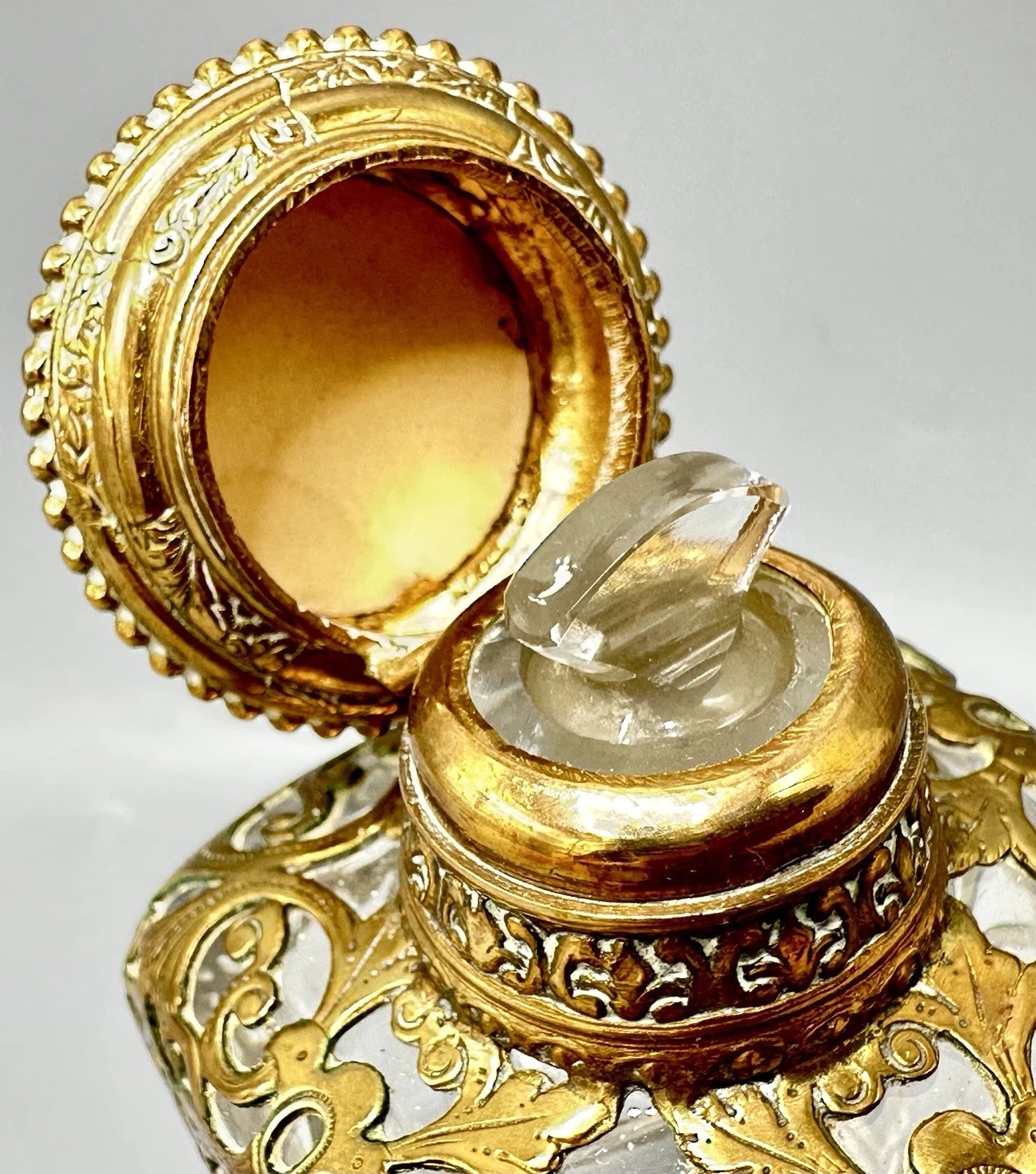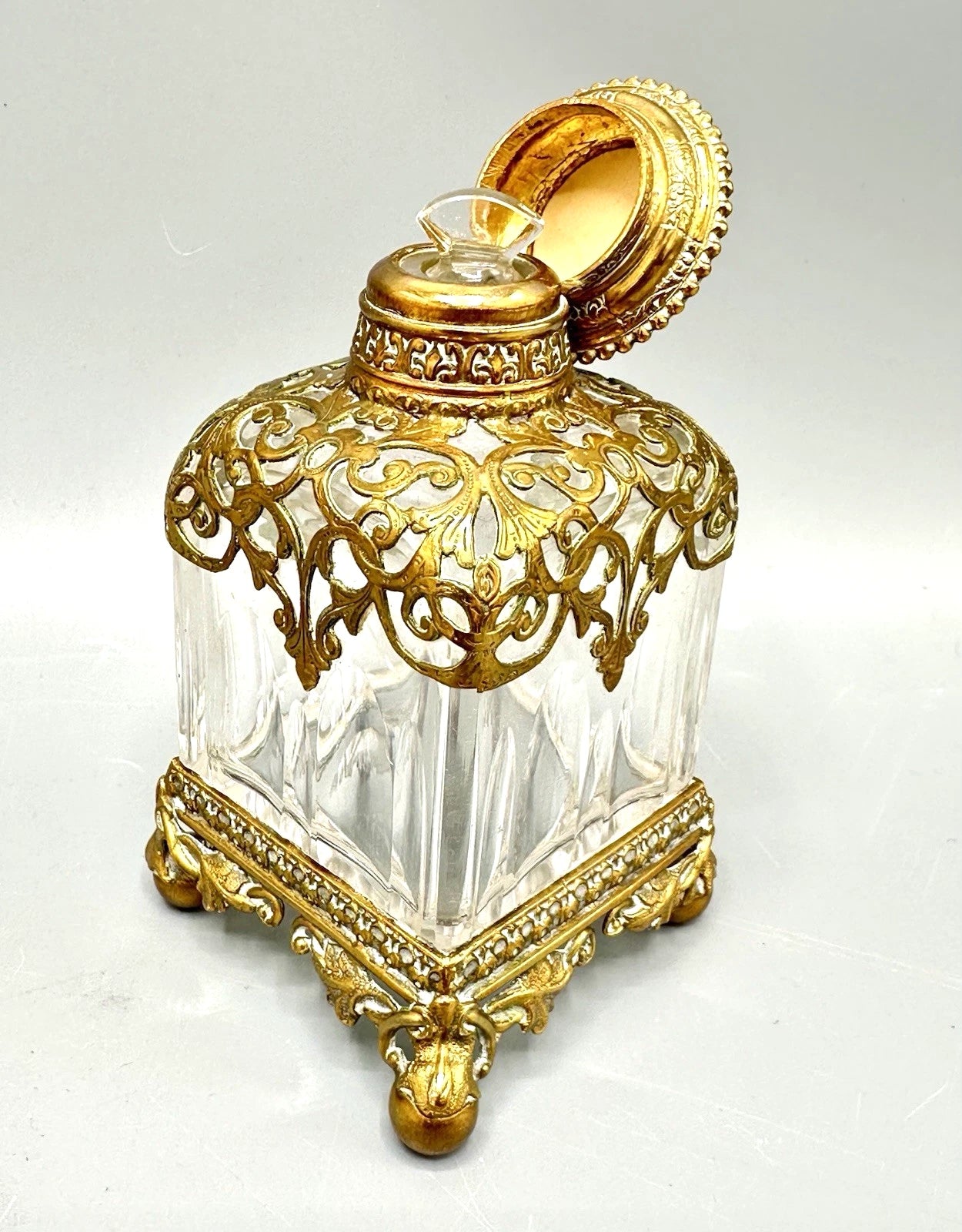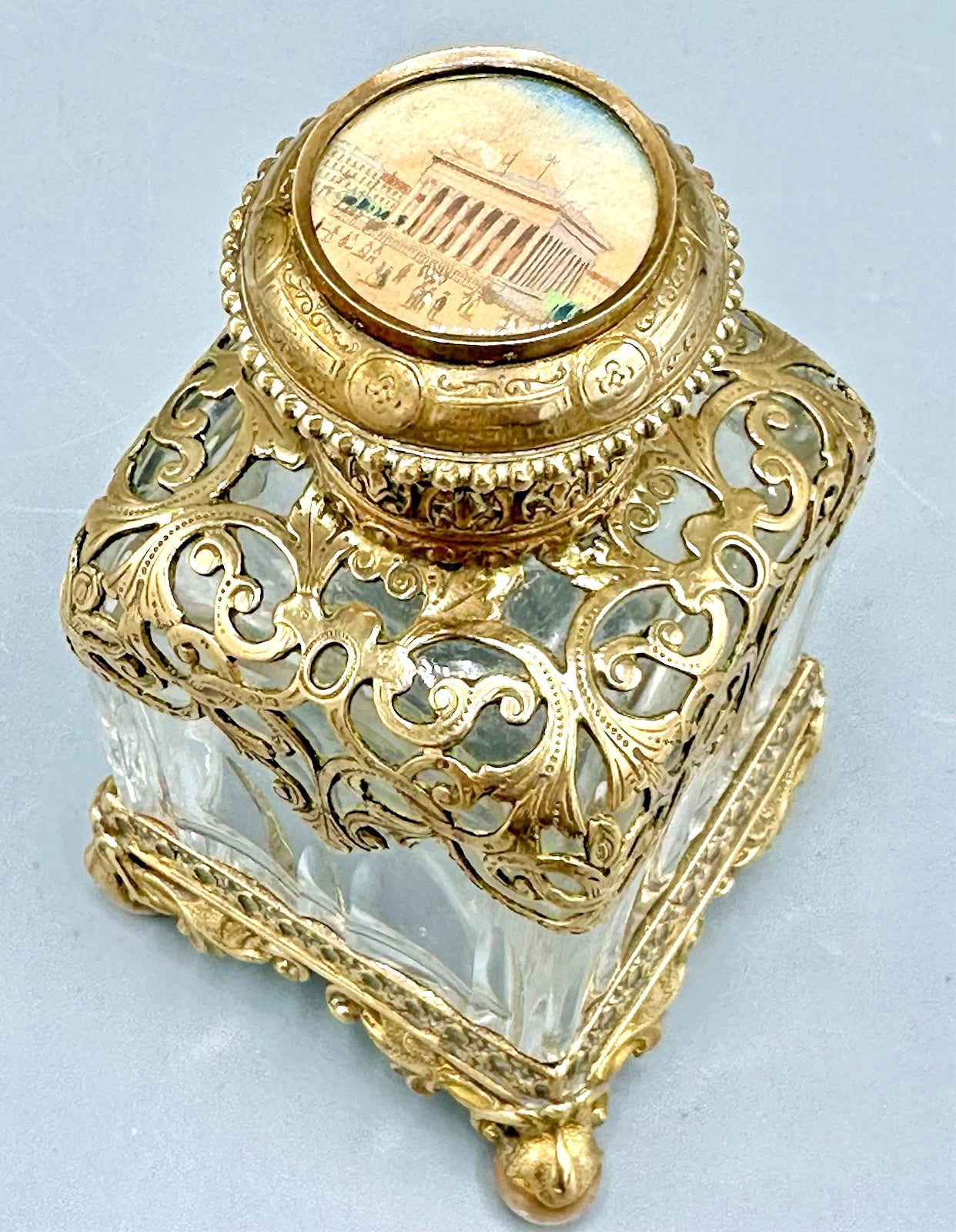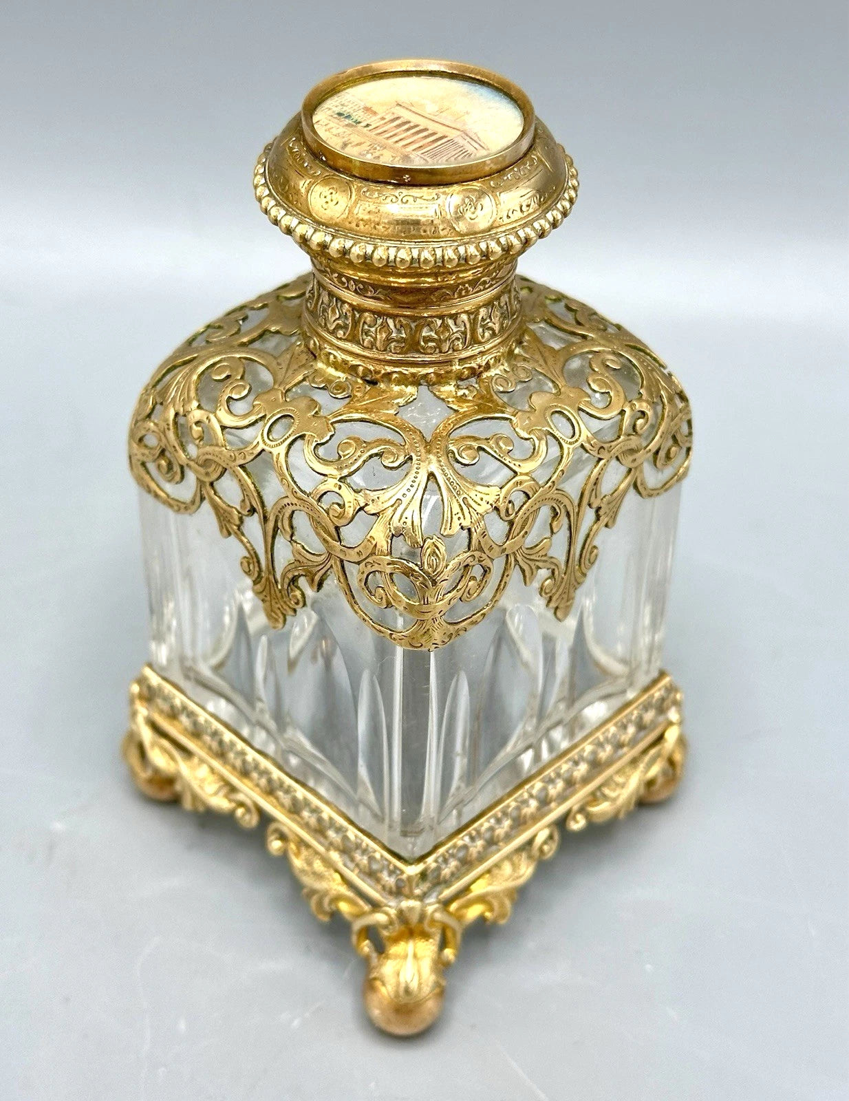 19世紀、ヨーロッパの貴族たちがグランドツアーの折にパリのパレ・ロワイヤルで購入したとされる、歴史的価値のある希少なアンティークボトルです。厚みのある上質なクリスタルガラスに、精巧なオルモル細工が施され、当時の贅を尽くした職人技が光ります。最大の特徴は蓋の天面に施された風景画で、ガラスの裏面から描き出すエグロミゼのような技法で当時の美しい意匠が遺されています。四方に脚の付いた重厚なフォルムは、ドレッサーやキャビネットを格調高く演出します。非常に古いお品ですので、経年による金属部分の変色や微細な摩耗は見られますが、大きな欠けやダメージはなく、アンティークとして良好なコンディションを保っています。当時のパリの華やぎを今に伝える、コレクターズアイテムです。サイズの詳細をご希望の方はお気軽にお問い合わせください。ビンテージ品の特性をご理解のうえ、ご購入をお願いいたします。
