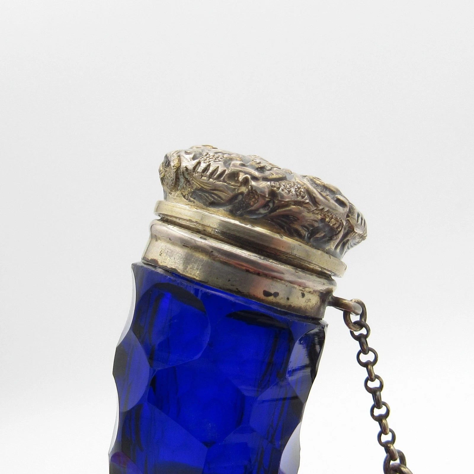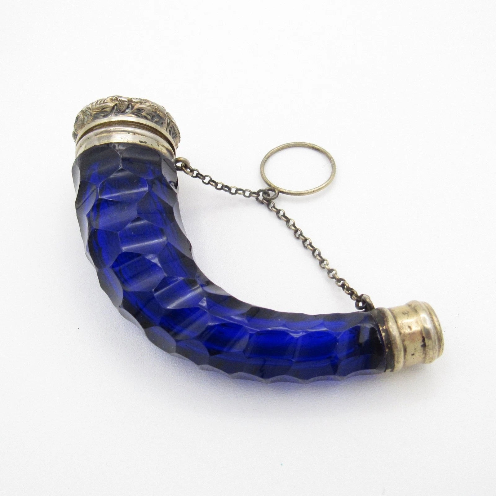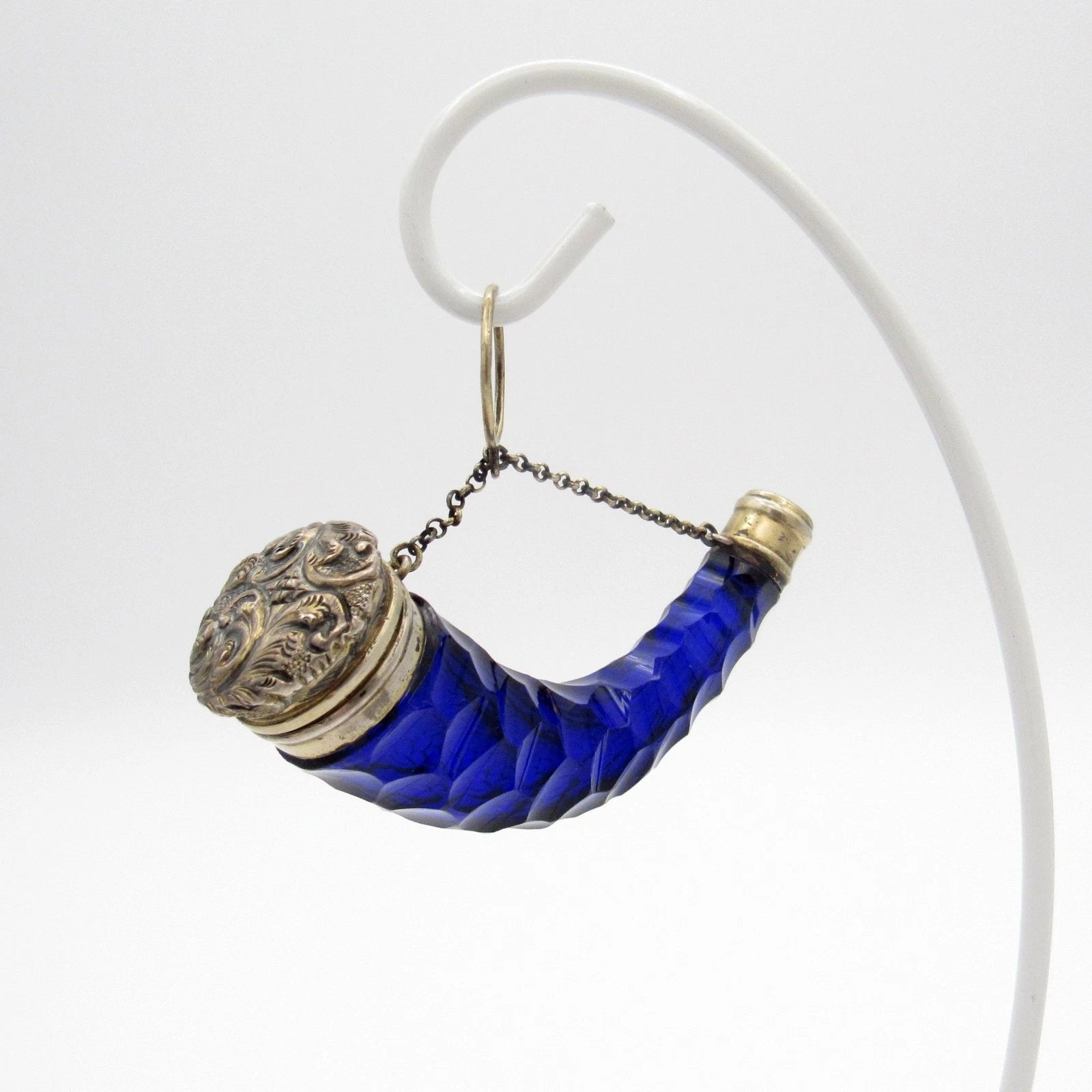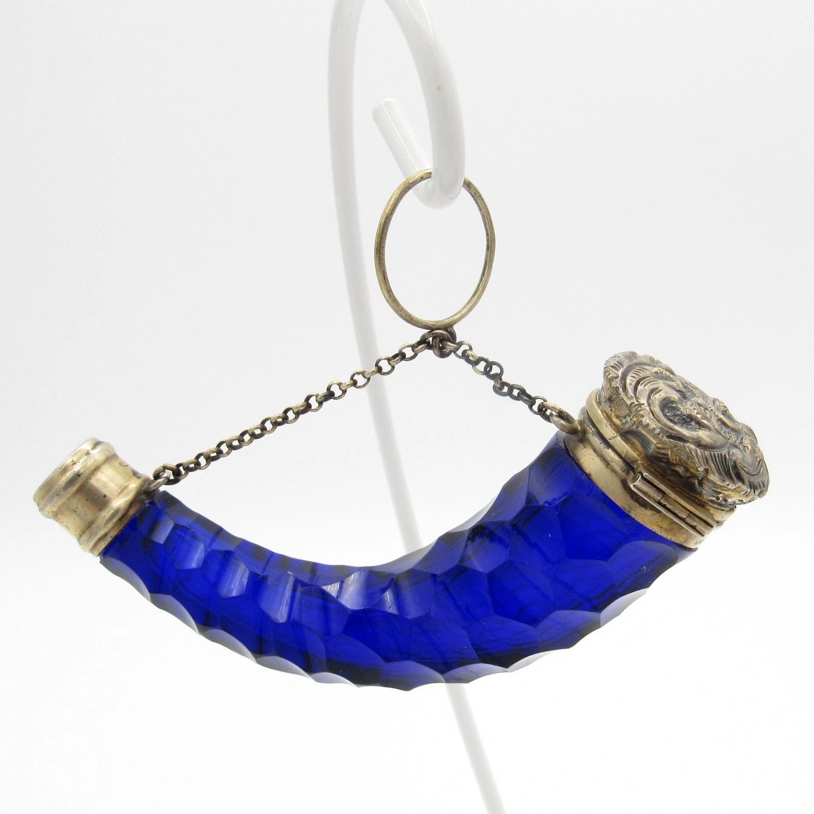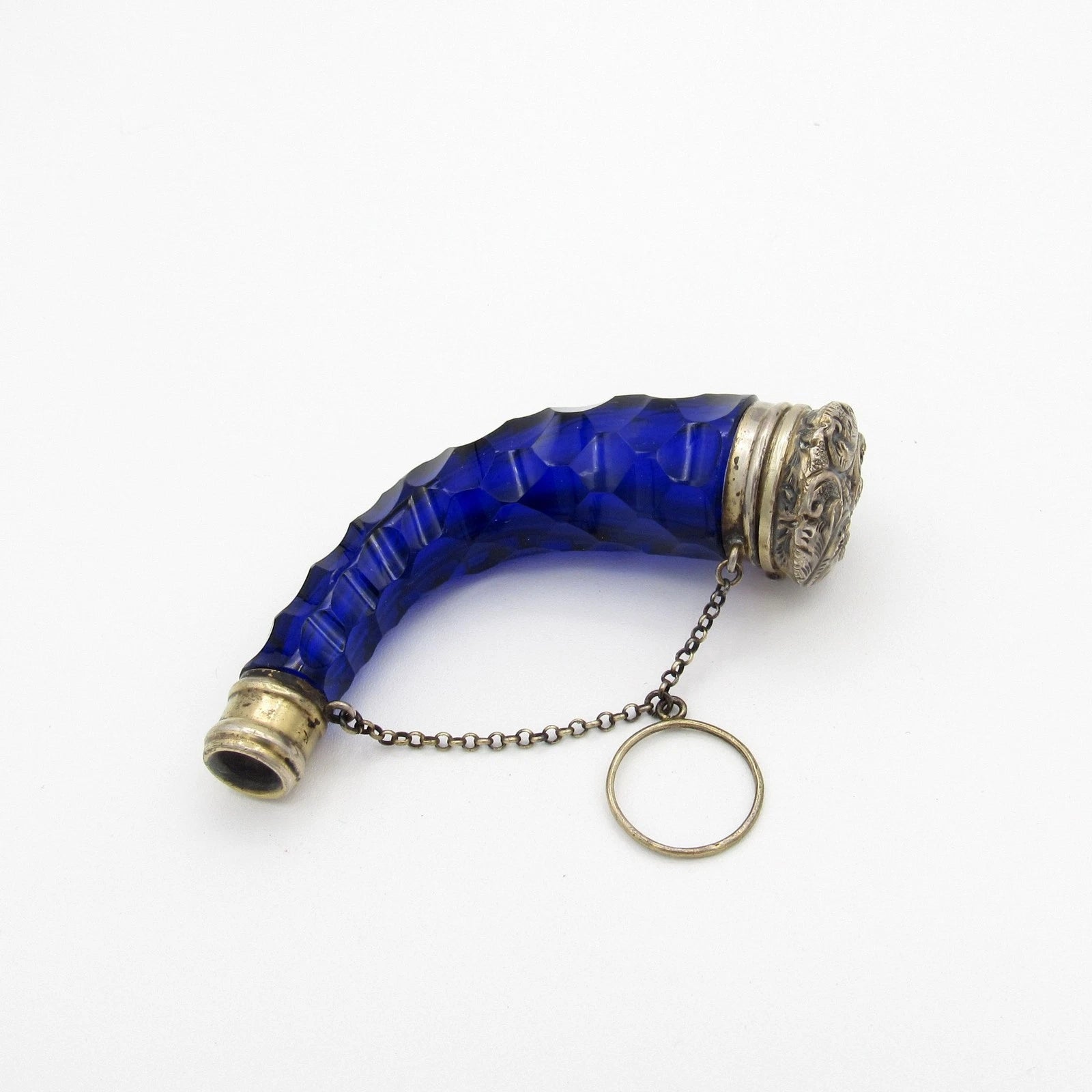 コバルトガラス 留め具付ヴィネグレット〈ホーン型・銀製蓋・指輪チェーン付〉
