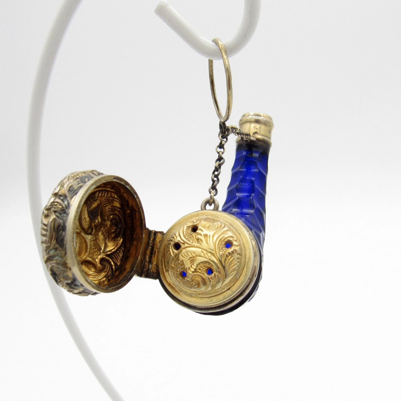 19世紀ヴィクトリア時代、貴婦人が香りを楽しむために持ち歩いた、希少なホーン型のヴィネグレットのご紹介です。深みのある鮮やかなコバルトブルーのカットガラスが美しく、光にかざすと宝石のような輝きを放ちます。蓋部分には精巧なスクロール装飾が施されたスターリングシルバーが使用されており、当時の職人による細やかな手仕事が息づいています。指に通して持ち運ぶためのフィンガーリングとチェーンが付属しており、シャトレーンの装身具としてもお使いいただけます。素材は上質なコバルトガラスとシルバーで、経年による銀特有の変色は見られるものの、ガラスにヒビや欠けはなく、アンティークとして非常に良好なコンディションを保っています。手のひらに収まるサイズ感ながら、当時の貴族文化の優雅さを象徴する、歴史的価値のある逸品です。サイズの詳細をご希望の方はお気軽にお問い合わせください。ビンテージ品の特性をご理解のうえ、ご購入をお願いいたします。